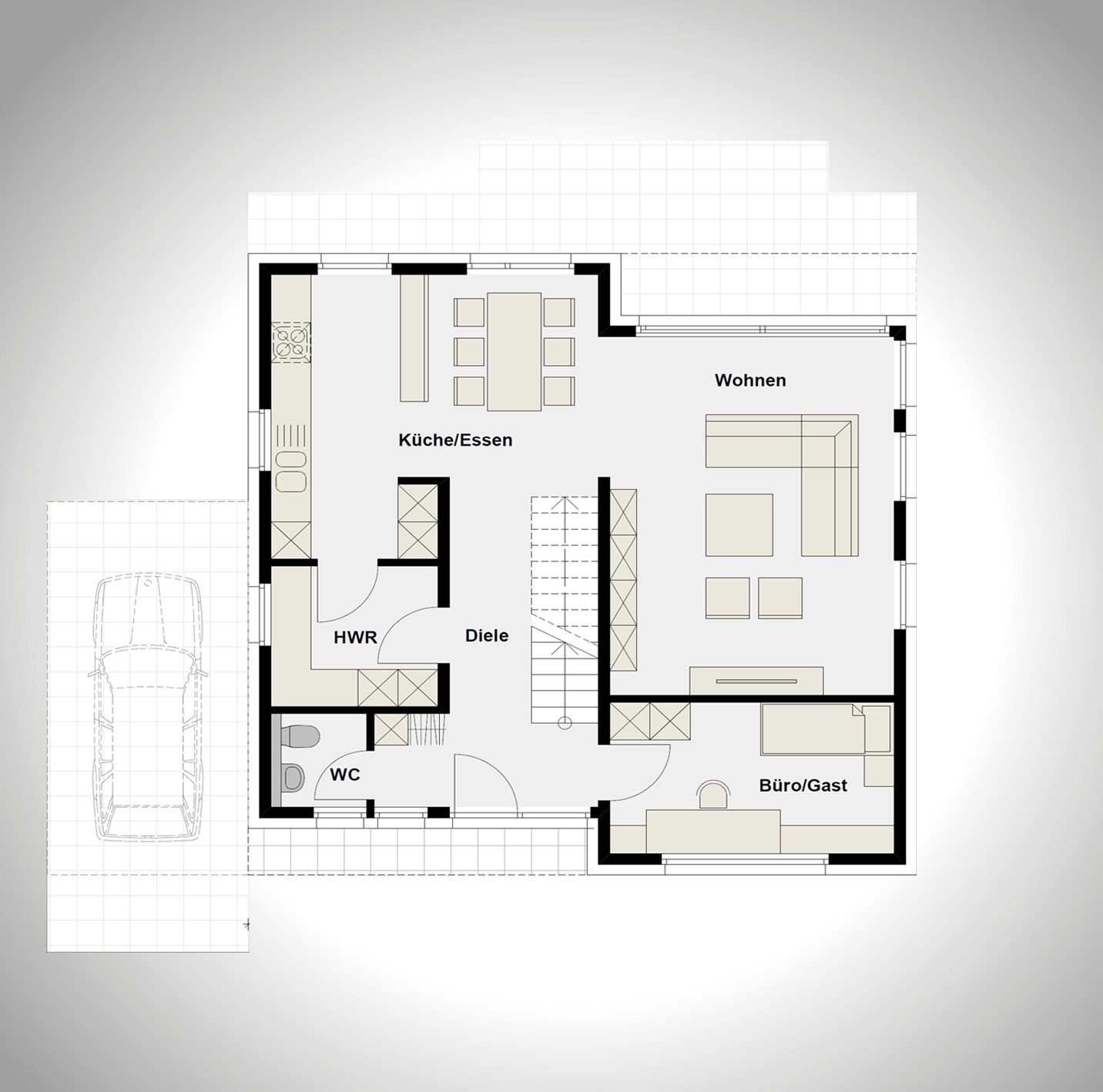 Hinweis:Die dargestellte Einrichtung dient der Veranschaulichung. Die tatsächliche Ausstattung richtet sich im Einzelfall nach der Bauleistungsbeschreibung
